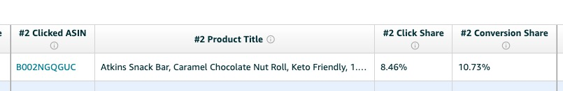 - From Brand Analytics, we see that the second most clicked item for “keto snacks” is getting 8.46% of the click share and 10.73% of the conversions.