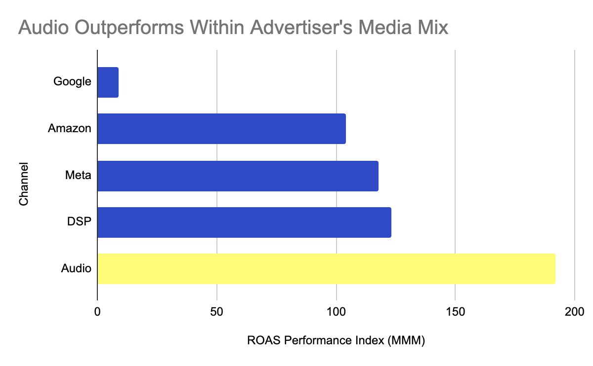 On a modeled basis, audio delivered over 2.5x the average CPA efficiency relative to the rest of the media mix, while maintaining strong incremental ROAS.